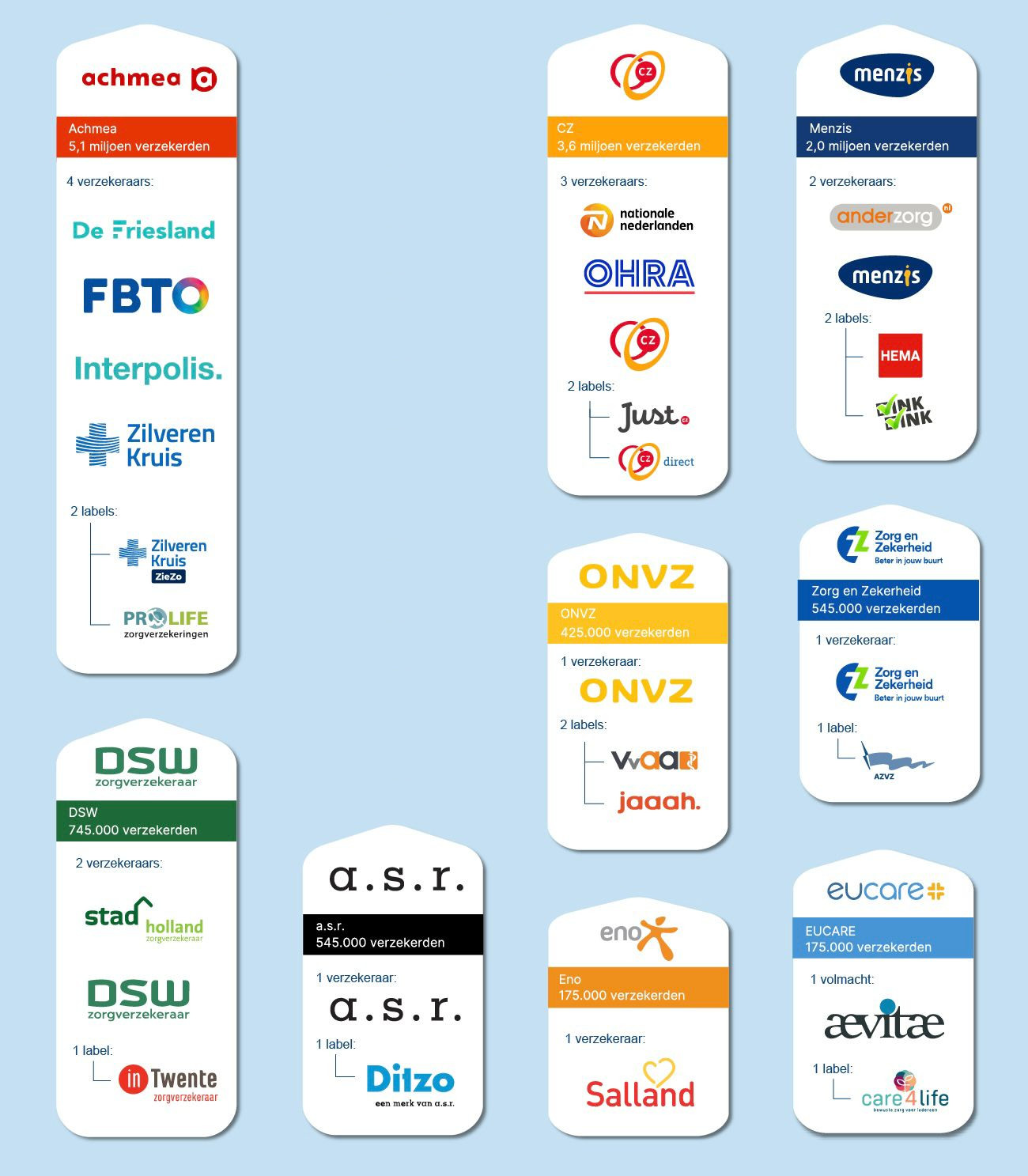 Voor het jaar 2025 hebben wij met alle verzekeringen, met uitzondering van VGZ, contracten afgesloten. Voor klanten die bij VGZ verzekerd zijn, stellen wij een factuur op die u zelf bij uw verzekering kunt indienen voor vergoeding. De kosten worden vergoed volgens de voorwaarden van uw contract. Voor alle andere verzekeringen sturen wij de facturen direct naar de betreffende verzekeraar. 4 Op deze afbeelding kunt u zien welke verzekeringsmaatschappijen bij elkaar horen.
